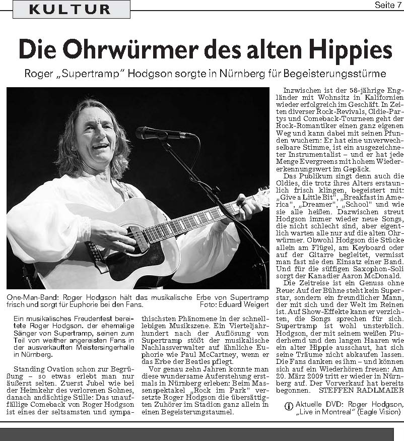 The time travel is an indulgence without remorse: On stage there is no superstar, but a friendly man, who is at peace with the world and himself. He can afford to forego show effects; his songs speak for themselves. Supertramp is probably immortal. Hodgson, who with his white wide shirt and long hair looks like a hippie, hasn’t let anyone buy his dreams off him. The fans are grateful to him – and they can already look forward to the next time: On March 20th, 2009, he will once again perform in Nuremberg. Advance bookings have already started.